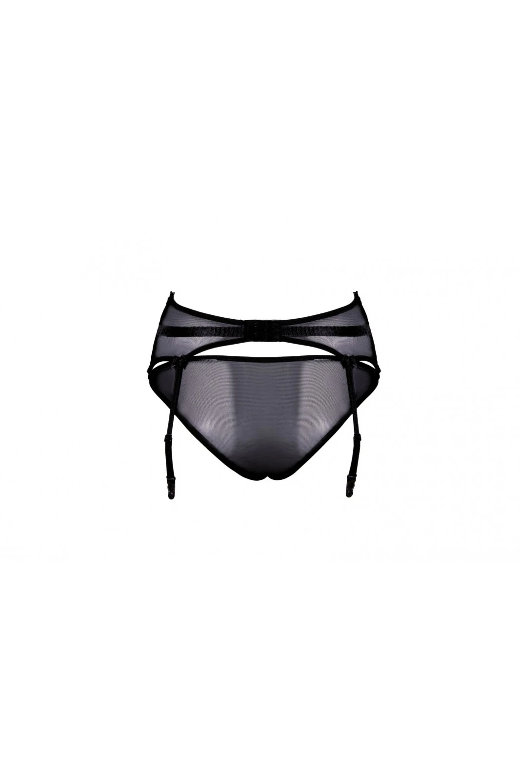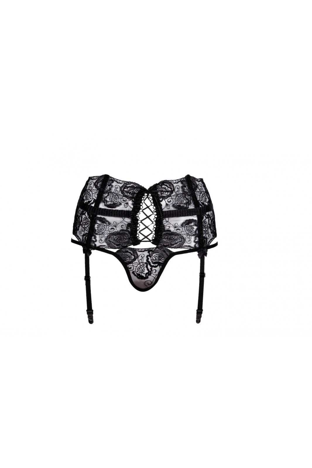 Ensemble trois pièces reprenant le modèle du Donna mais en y ajoutant un bustier sexy dans cette même dentelle noir à motif floral. S’attache sur l’arrière, le laçage avant n’est que décoratif. Porte-jarretelle inclus.