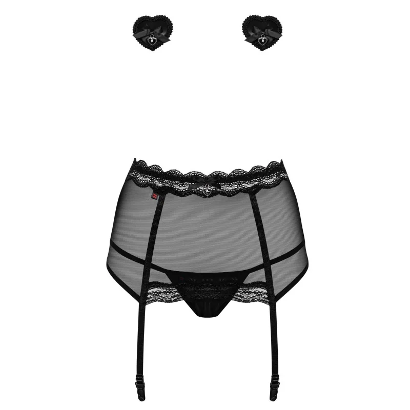 Un bel ensemble lingerie séduction, magnifique pour charmer, ce coffret comprend un Porte jarretelle à laçage un string et un duo de cache seins séduction.