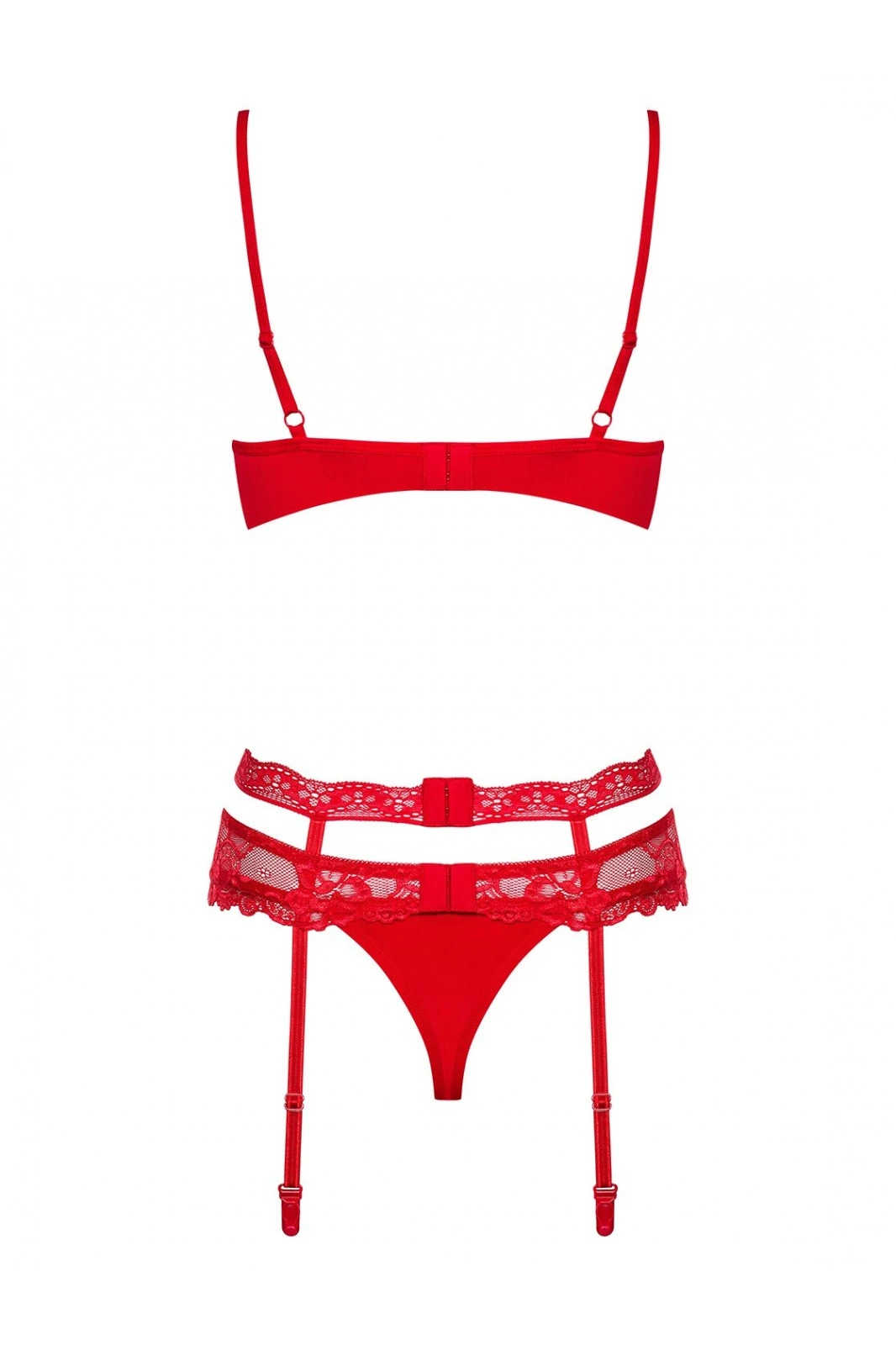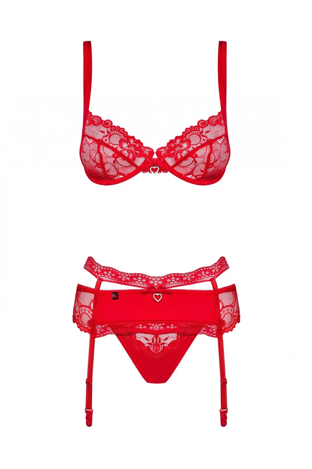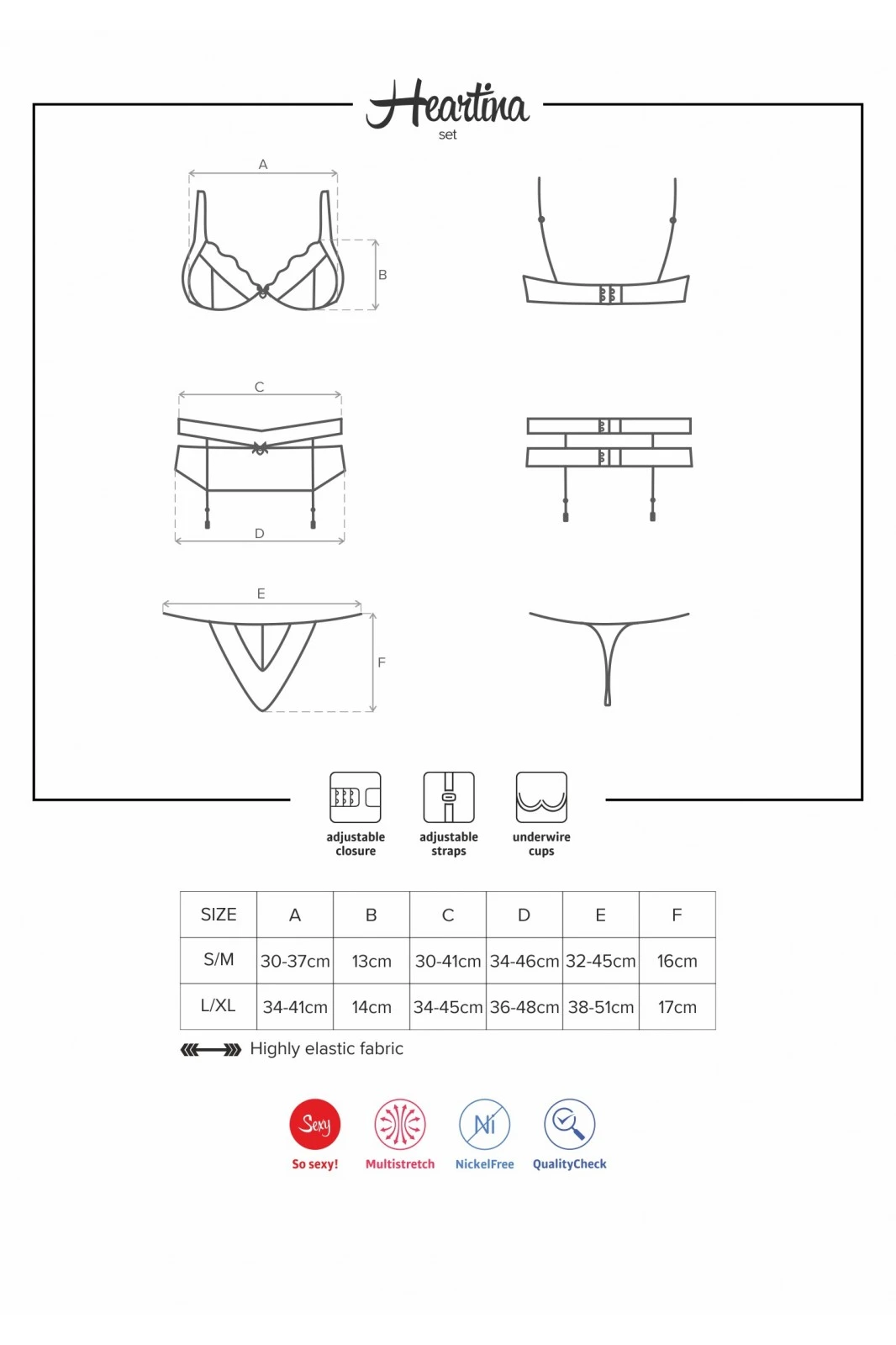 Un rouge passion qui va enflammer les sens pour cet ensemble 3 pièces irrésistible qui sera parfait pour un cadeau de Saint Valentin. Un soutien-gorge à armatures avec bonnet de dentelle et réglages des bretelles et dans le dos. Un porte-jarretelles avec double bande de dentelle et double réglage sur les reins, jarretelles réglables également et un string sexy assorti. Le soutien-gorge et le porte-jarretelles sont décorées d’un coeur en strass. La composition est de 85% Polyamide, 15% ElasthanneDécouvrir toute la collection de lingerie sexy Heartina Obsessive