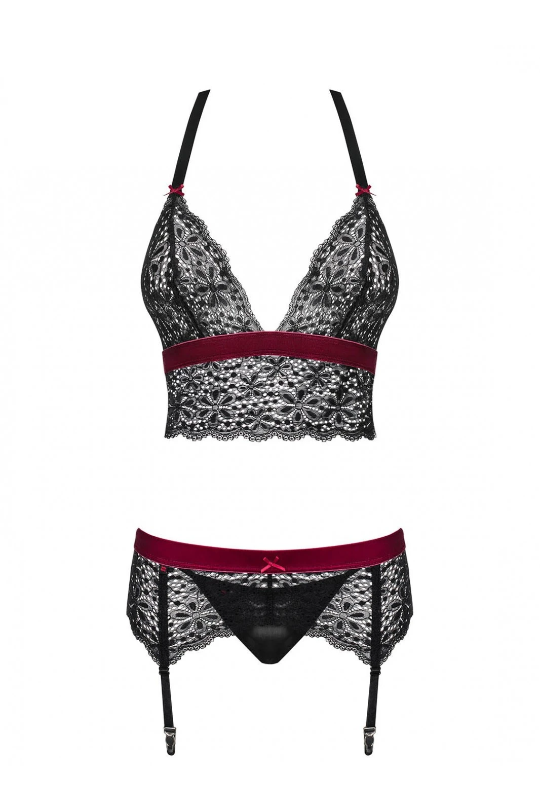 L’ensemble comprend un soutien-gorge, un string et un porte-jarretelles assortis (bas non compris).