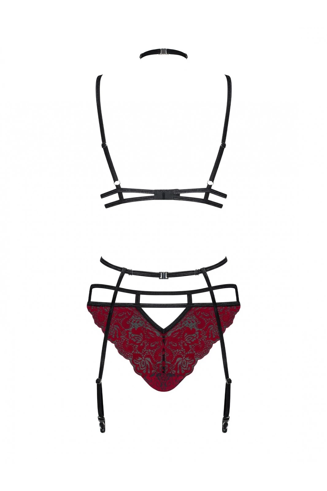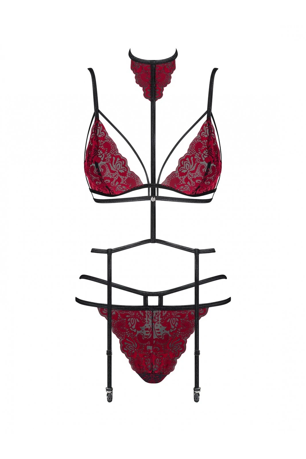 - Soutien-gorge, culotte et tour de cou en dentelle reliés au porte-jarretelles par une bretelle