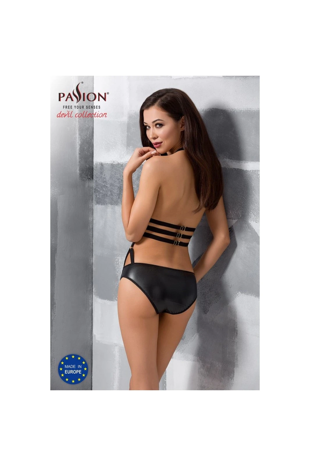Ses bonnets triangles sont maintenus par des bretelles qui passent derrière le cou, laissant un dos nu sensuel interrompu par 3 lanières qui mettent en valeur la chute de vos reins et font le tour de votre buste pour souligner votre poitrine. La culotte est reliée au top par un nouveau jeu de lanières sur les flancs et centre du ventre, l’effet est particulièrement sexy !